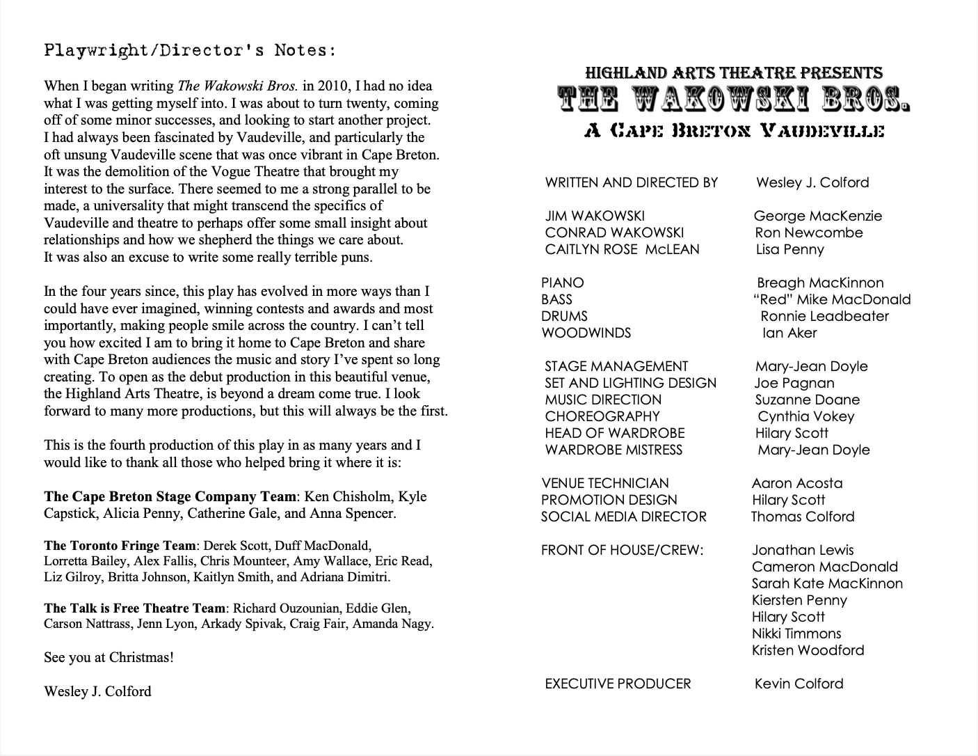 Written and Directed by Wesley J. Colford, this award-winning, original musical has been professionally mounted across Ontario and now at last returns home to Cape Breton with an all-star cast of local talent:
