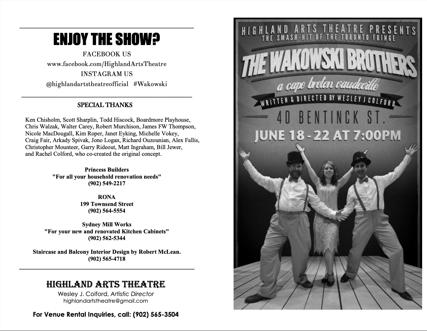 Discover Sydney's latest downtown venue - The Highland Community Centre for Arts and Culture, formally St. Andrew's Church - in this debut production: THE WAKOWSKI BROTHERS - A CAPE BRETON VAUDEVILLE.
